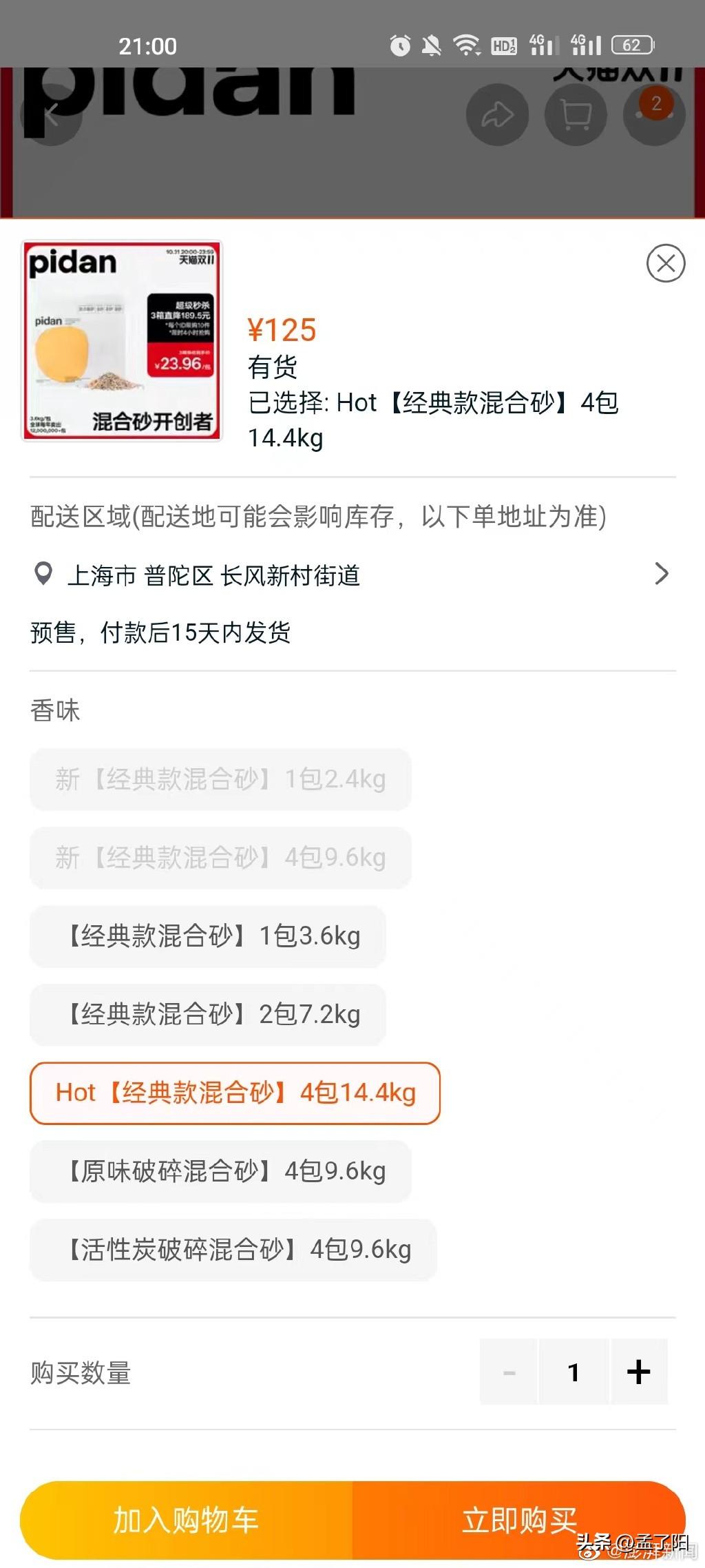 消费者王女士称,双十一预售时,她曾在淘宝平台pidan旗舰店里看中了一款猫砂,前段时间同款猫砂的价格是106元,但后来突然调整至159元。